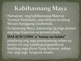 ANG KABIHASNAN SA MESOAMERICA Maraming siyentista ang naniniwalang may mga pangkat ng mga mangangaso o hunter ang nandayuhan mula sa Asya patungong North America libong taon na ang nakaraan. Ang kauna-unahang Kabihasnan umusbong sa MesoamericaCENTRAL AMERICA o maging sa kabuuan ng AMERICA. Ano ang dahilan kung bakit naputol ang ugnayan ng mga tao sa Amerika mula sa iba pang mga kabihasnang umusbong sa ibat ibang panig ng daigdig.
