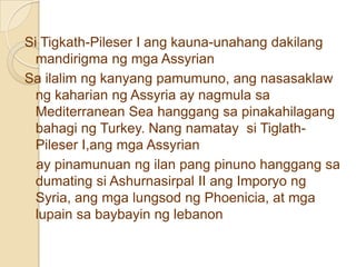 Sinakop rin nila ang Jerusalem Syria at Ehipto. Hindi makaka-angat ang kasalukuyang teknolohiya kung hindi dahil sa pondasyon na ginawa ng sinaunang kabihasnan. Imperyo ng Assyrian.