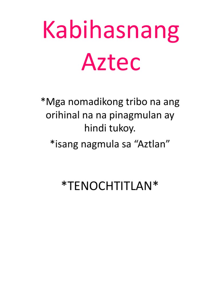 Ito ay simulang itinatag noong yugtong bago-Klasiko c. View KABIHASNANG AZTECpptx from AP 101238 at Pangasinan State University. 7 Sa pagaakala ni Montezuma II na pinuno ng mga Aztec na si Cortes ay kanilang diyos dahil sa kaputian ng mga balat ng mga ito ay tuluyan nang nagtapos ang Tenochtitlan.