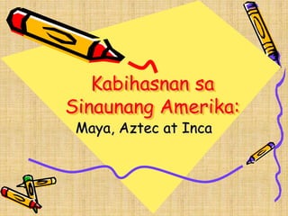 Kapangyarihan sa MesoAmerika ay ang Aztec kung saan ang ginawa nilang sentro ay Tenochtitlan at ang mga Inca naman ay namayani sa Bundok Andes kung saan Cusco naman ang ginawang sentro. Sibilisasyon ng Maya Ang kabihasnang Maya ay nahukay sa kagubatan ng Guatemala Honduras at Katimugang Mexico. 2000 BK hanggang 250 BK ayon sa.