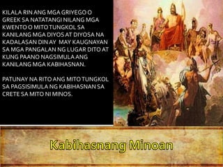 Paano lumaganap ang kabihasnang greek. Mabundok ang Greece kung kaya ang nabuong kabihasnan nito ay pawang watak watak na. Ibalik ang kagandahan ng sinaunang kulturang Greek at Roman sa pamamagitan ng pag-aaral sa panitikan at kultura ng mga nasabing sibilisasyon. Ano ang katangian ng Kabihasnang Minoan at Mycenaean.